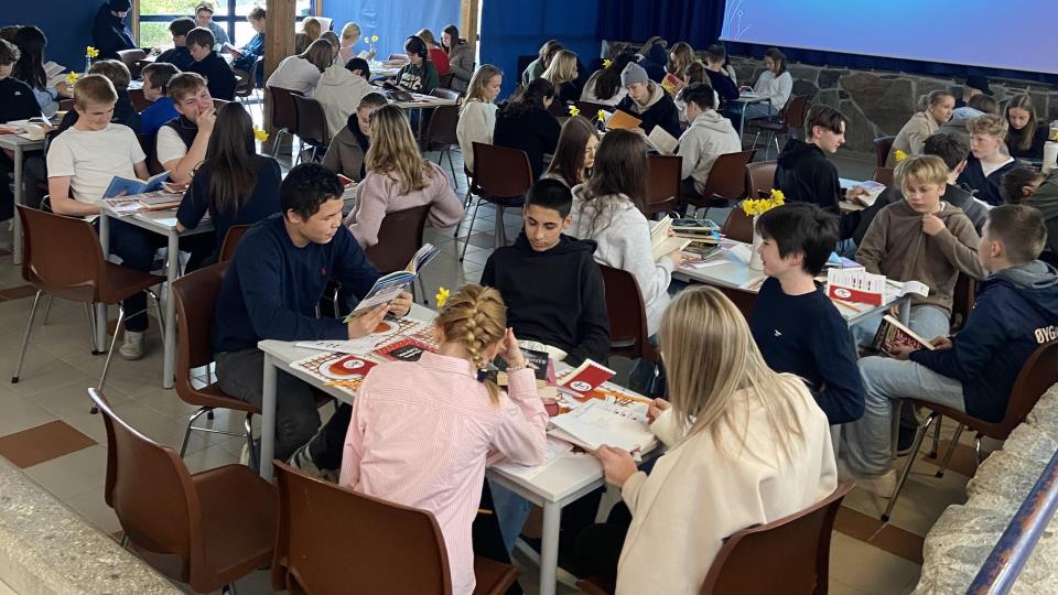 Bokkafe på Øygarden ungdomsskule Tenk deg 105 lesande ungdommar samla i eit rom.Rundt små bord sit elevane gruppevis. Det er heilt stille. Ein høyrer knapt at dei blar seg vidare. All... Publisert 24.04.2026 kl. 09.02
