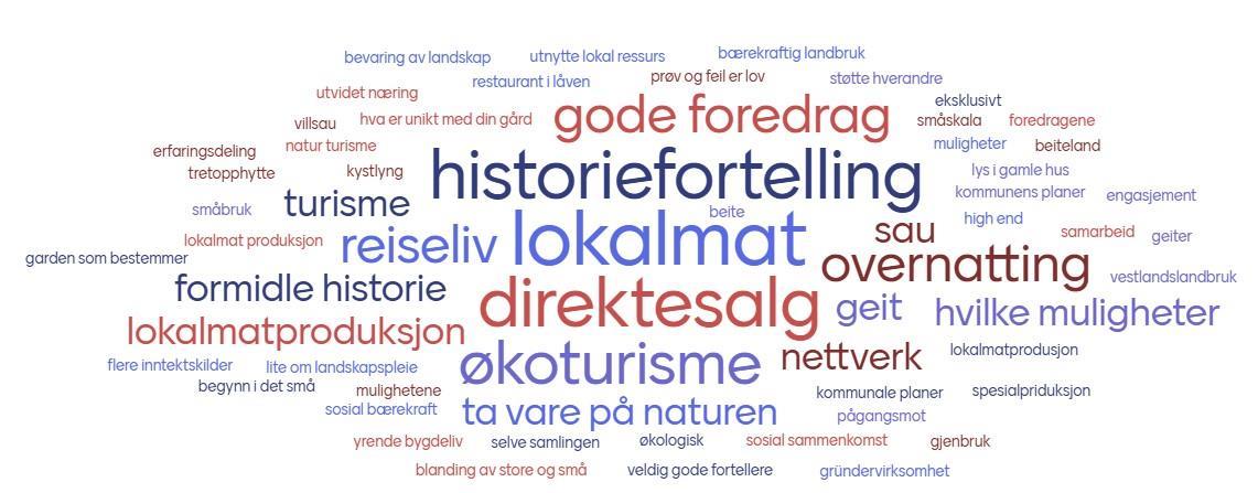 lokalmat, historieforteljing, direktesal, reiseliv, økoturisme, natur, nettverk og moglegheiter.