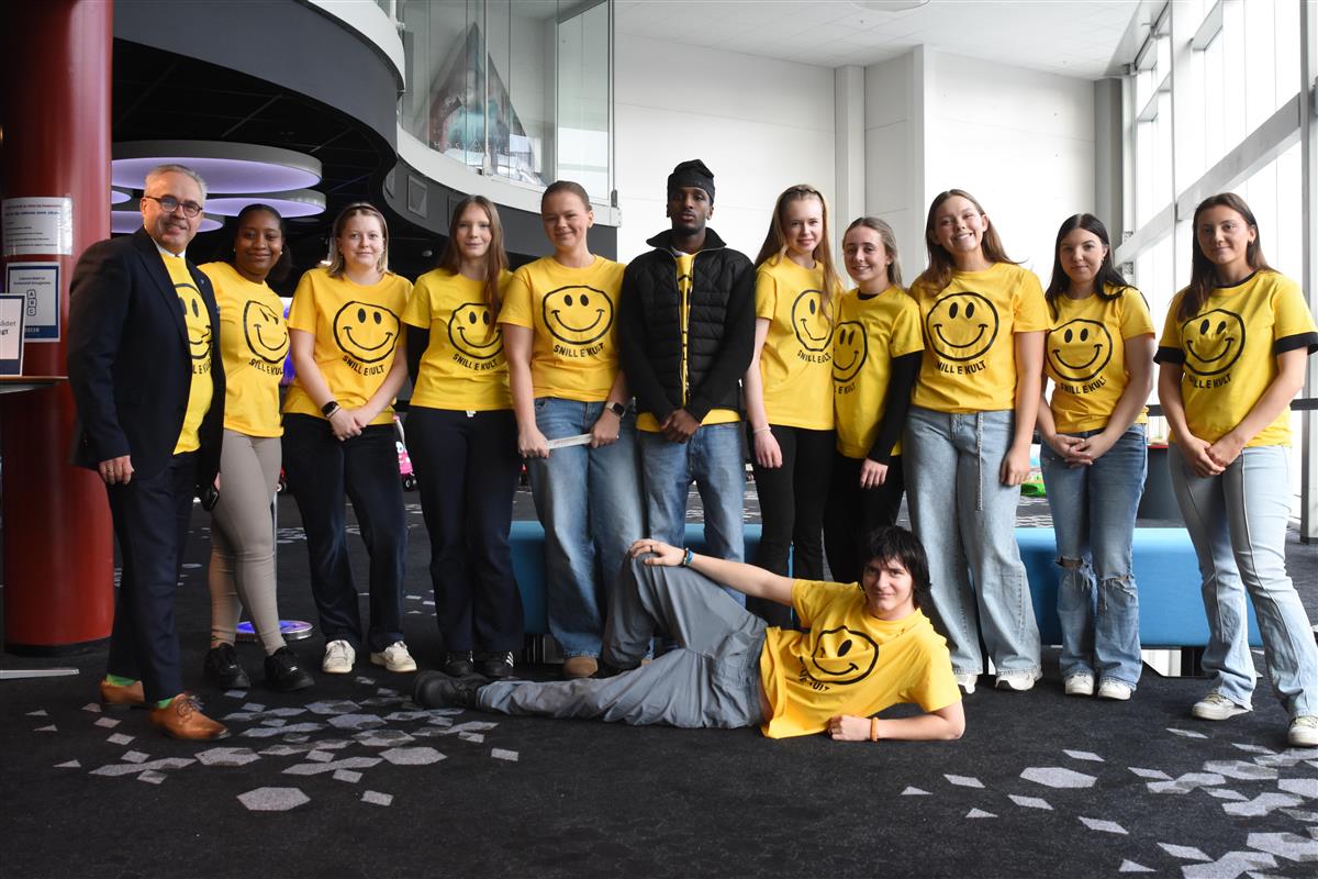 Ordførar Tom Georg Indrevik saman med elevar på barne- og ungdomsarbeidarlinja på Sotra vidaregåande skuleRolf Øvretveit sa at han hadde møtt ein elev som ikkje hadde det bra og at det var det som gjorde at ideen om «Snill e kult» skaut fart. Han ville ikkje fokusera så mykje på utanforskap, men det å vera snill.