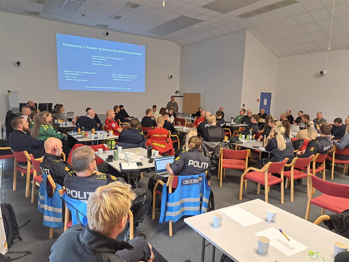 Frå skrivebordsøvinga tysdag.Øvinga omhandla gasseksplosjon/brann, evakuering på Kollsnes prosessanlegg med alvorlege konsekvensar for personell. Øvinga var eit samvirke mellom Gassco, Equinor, Øygarden kommune, politiet, helse og brann.