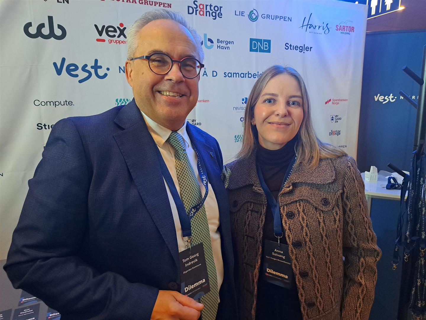Camilla Nygård i Sparebanken Norge deltek "alltid" på Øygardskonferansen. Til venstre; Johnny BreivikTo andre veteranar på konferansen var Jarle Vindenes i Sotra Gruppen og tidlegare direktør i Tide og fleire lokale trafikkselskap i regionen, Bjørn Ove Børnes.