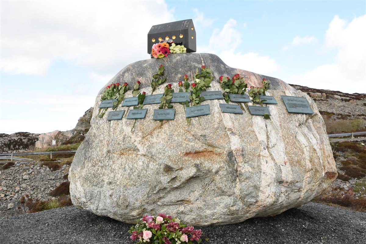 Minnesteinen ved TurøynaEquinor flaggar på dei norske kontorstadene. Kommunen og Equinor flaggar for å visa respekt og å minnast dei omkomne.