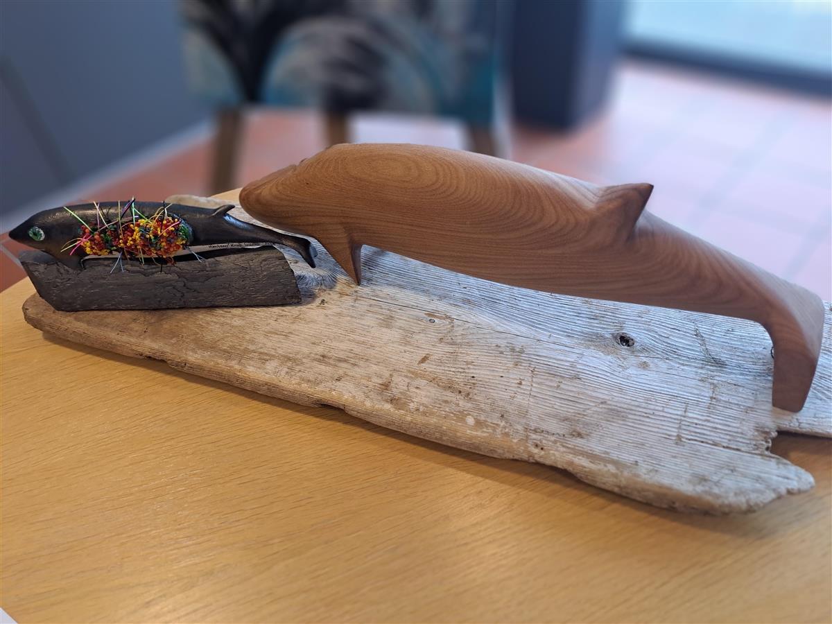 Kenneth Bruvik som i mange år har kjempa for miljøet og ein rein kyst, har laga til to mindre treskulpturar av plastkvalen.