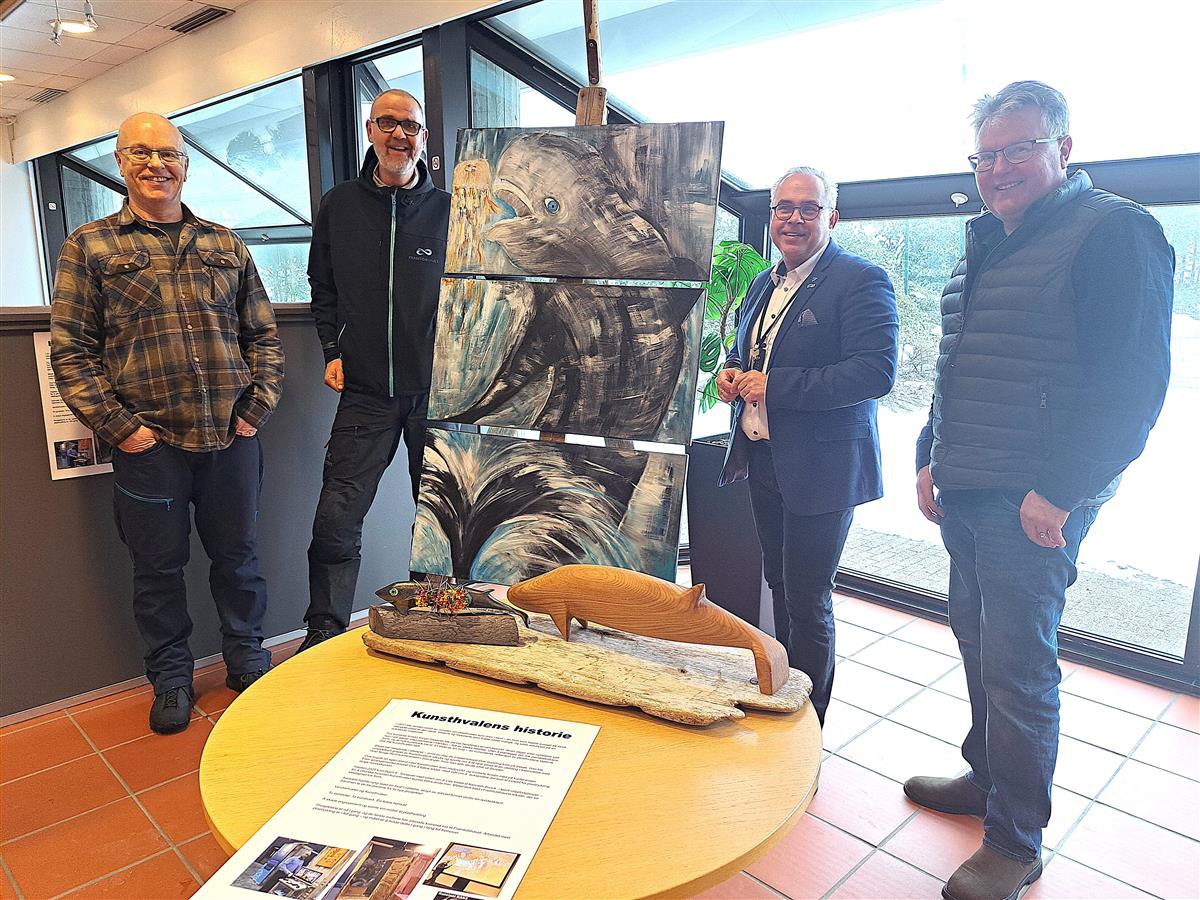 No er ustillinga plassert på rådhuset. Om ei tid vert han plassert på innbyggartorget og biblioteket, Frå venstre; Ove Gudding, Kenneth Bruvik, Tom Georg Indrevik og Bjørn E. Sissener.For kunstnar Kristin Krogh Sissener vart funnet av plastkvalen eit vendepunkt. Nokre dagar etter nyheitene sat ho i atelieret sitt med penslane i handa, fylt av sterke kjensler. Utan å planleggja det, tok penselsstrøka form, og eit nytt kunstverk vart til. Eit bilete av ein kva, ein kunstnarisk refleksjon av lagnaden til plastkvalen. Slik vart Kunstkvalen fødd.