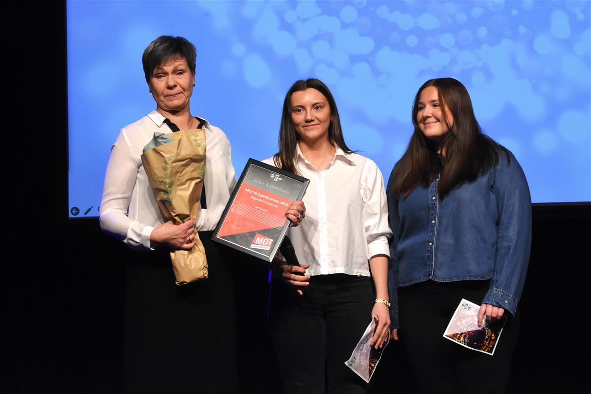 Vigdis Taranger fekk MOT til å glede-prisen. Prisen vart delt ut av Amalie Stusdal og Oline KaalaasVigdis er utdanna barne- og ungdomsarbeidar og har gjennom sin lange karriere jobba i både barnehage, ungdomsklubb, MOT og skule samt at ho har vore med på sommaraktivitetar og arrangement.
