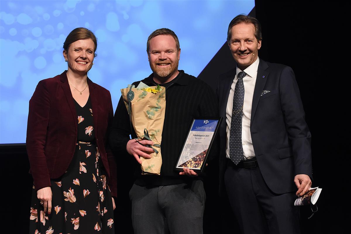 Folkehelseprisen gjekk til André Clausen. Til venstre; kultursjef Marian Guddal Hansen og til høgre; leiar i levekårsutvalet Ernst Einarsen.Podkasten Rådhuset gjorde opptak fredag kveld der alle prisvinnarane vart intervjua. Episoden vert publisert 24. mars kl. 07.00.