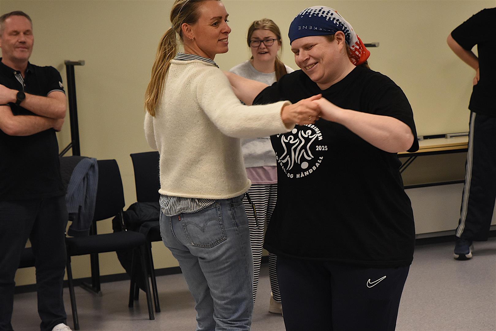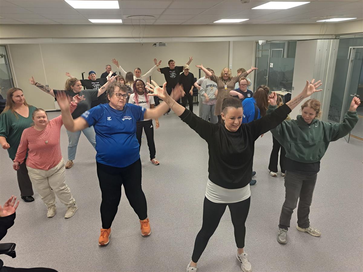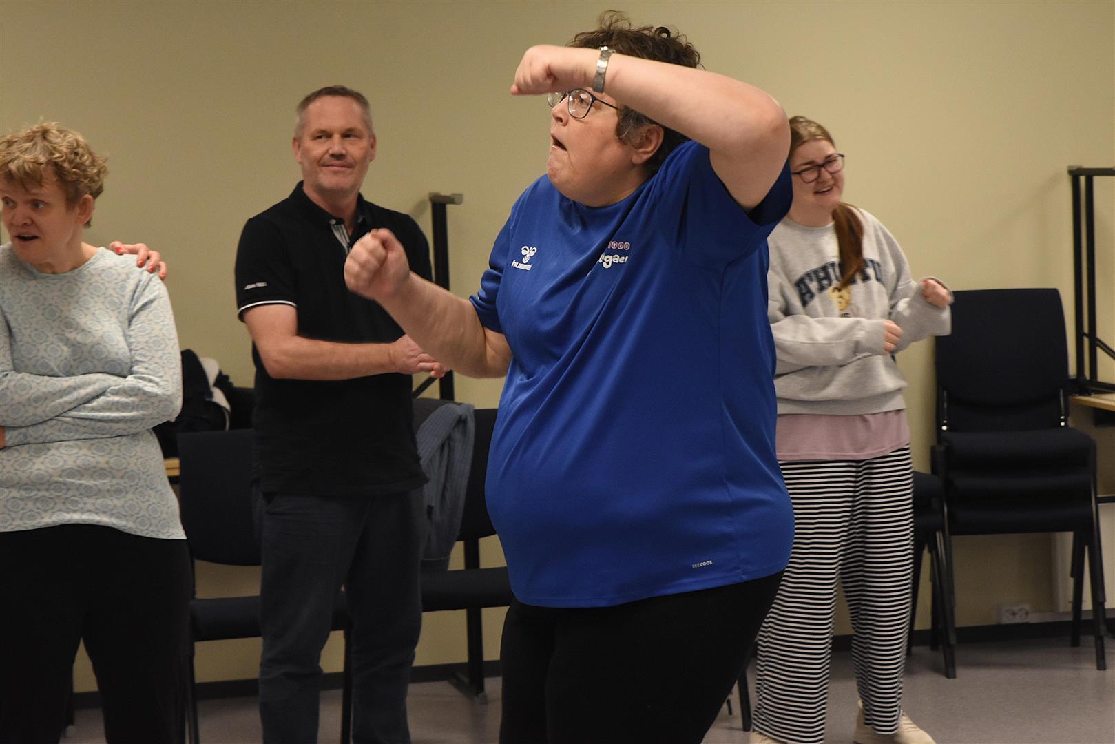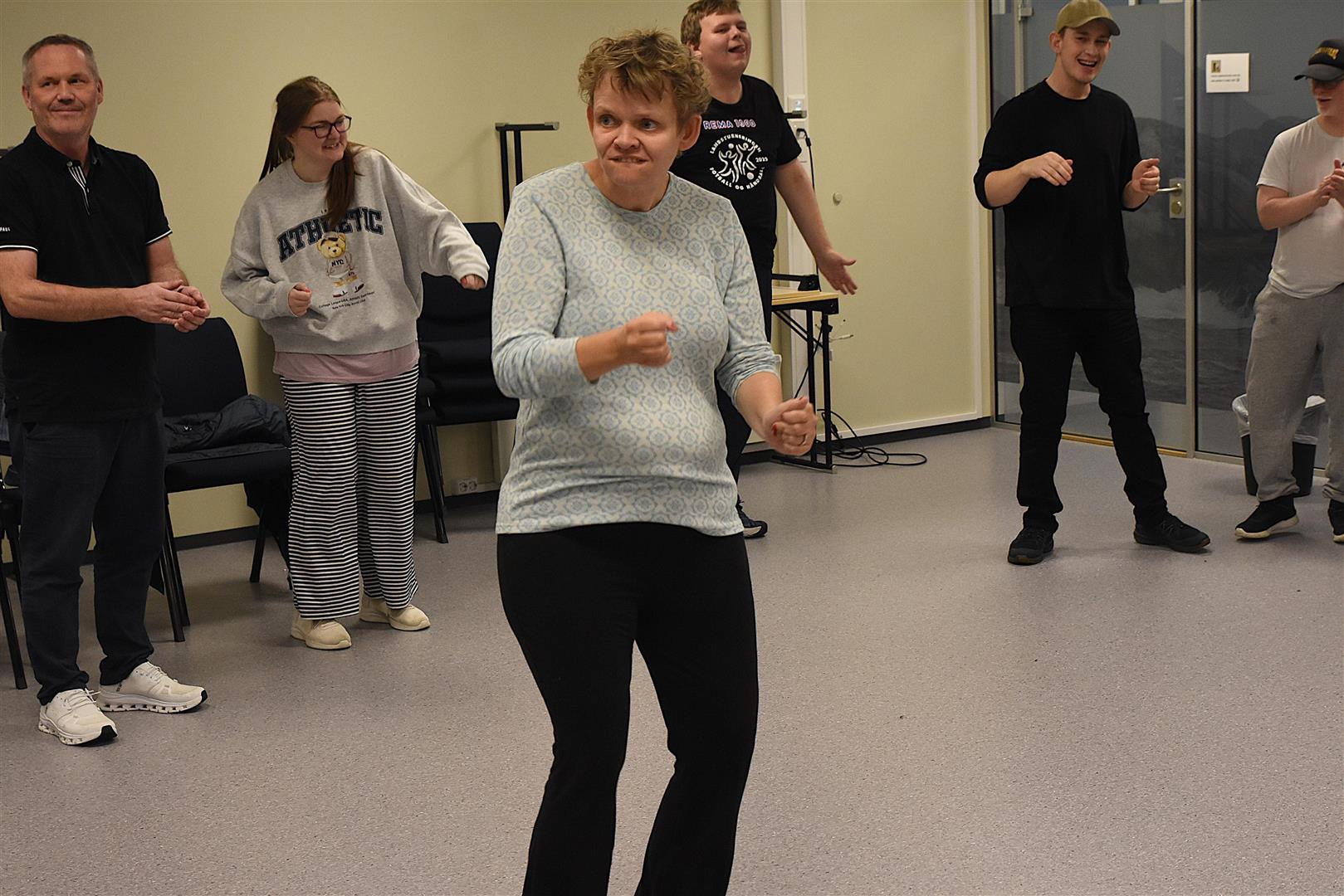 Klare for dansekampInstruktør Jannike Midttveit får alle deltakarane med på dansen. Humøret er på topp.