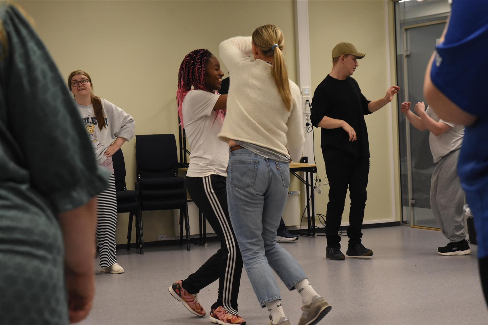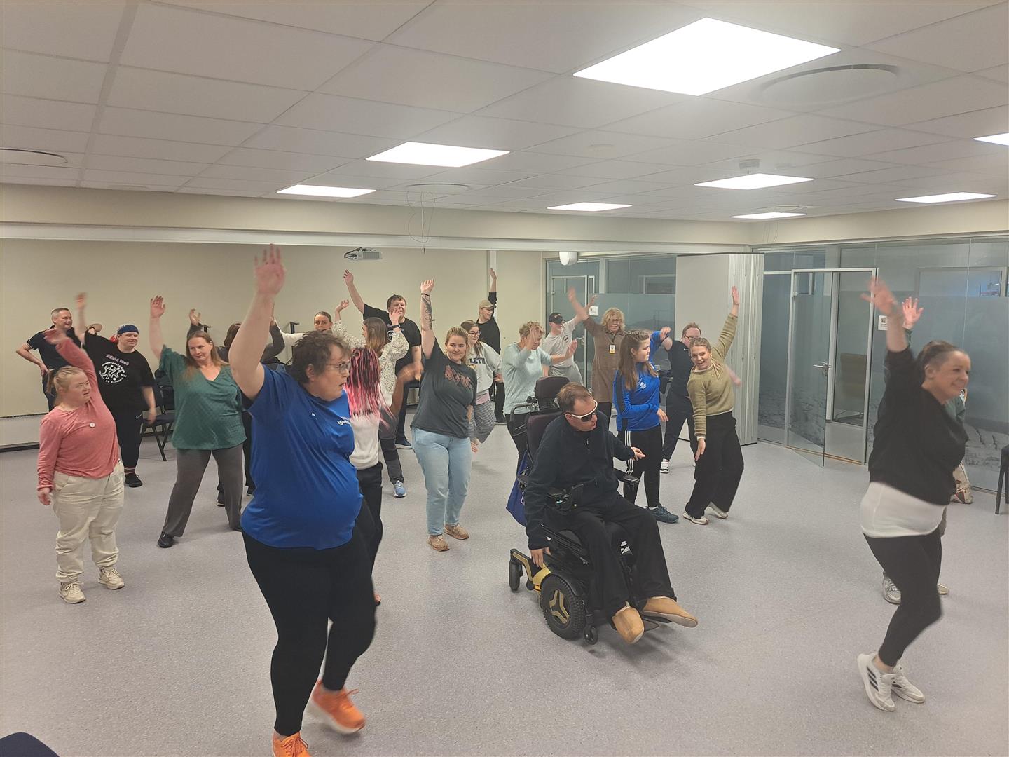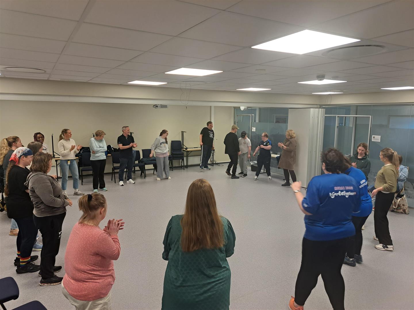 Klare for dansekampInstruktør Jannike Midttveit får alle deltakarane med på dansen. Humøret er på topp.
