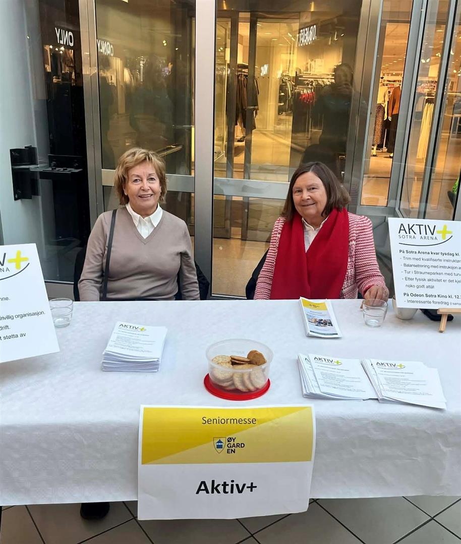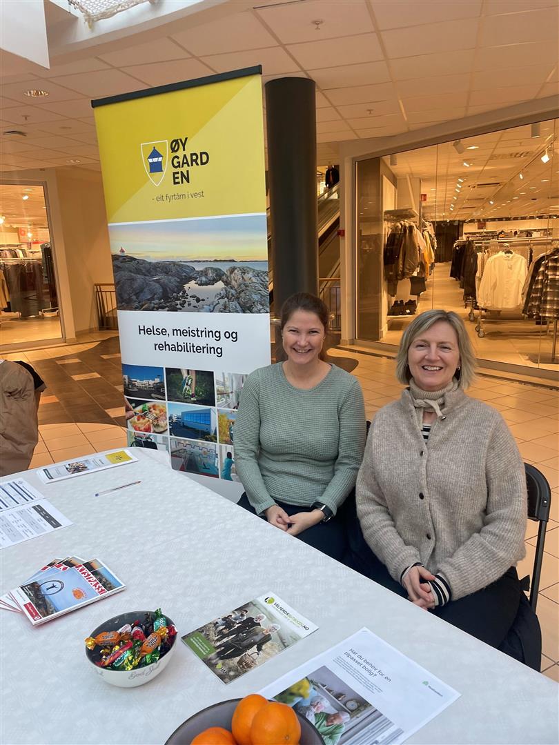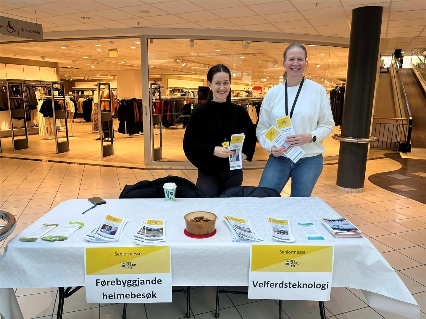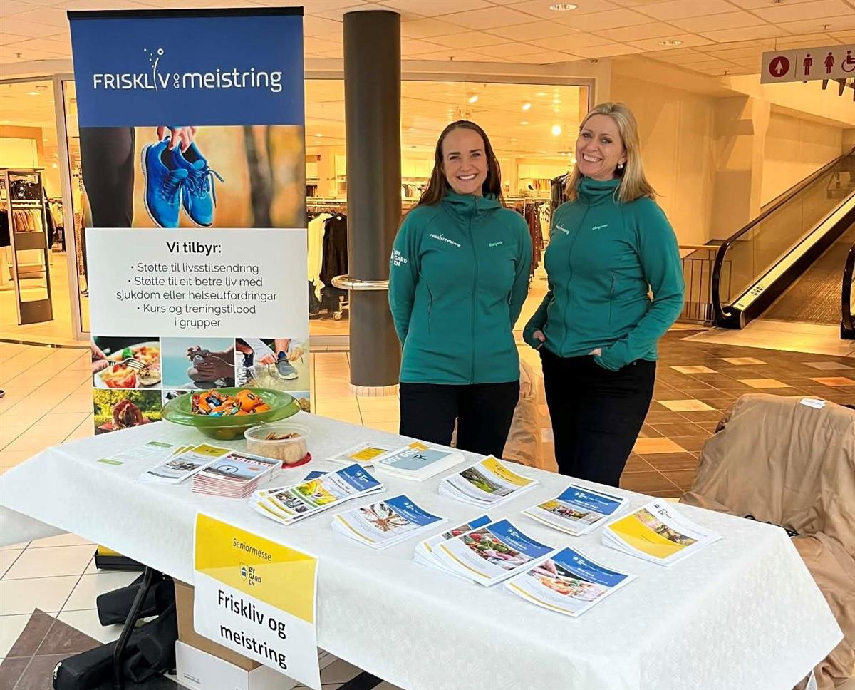 Linn Jeanette Waagbø (til venstre) og Janicke Hatland Engebretsen i friskliv og meistring inviterte til seniormesse på Sartor Storsenter.I Øygarden kommune ønskjer vi å leggja til rette for at ein kan bu heime så lenge som mogleg. Det er naudsynt at eldre får god forståing om korleis ein kan planleggja og ta grep for ei friskare aldring gjennom betre levevanar, som til dømes auka fysisk og sosial aktivitet og betre kosthald.