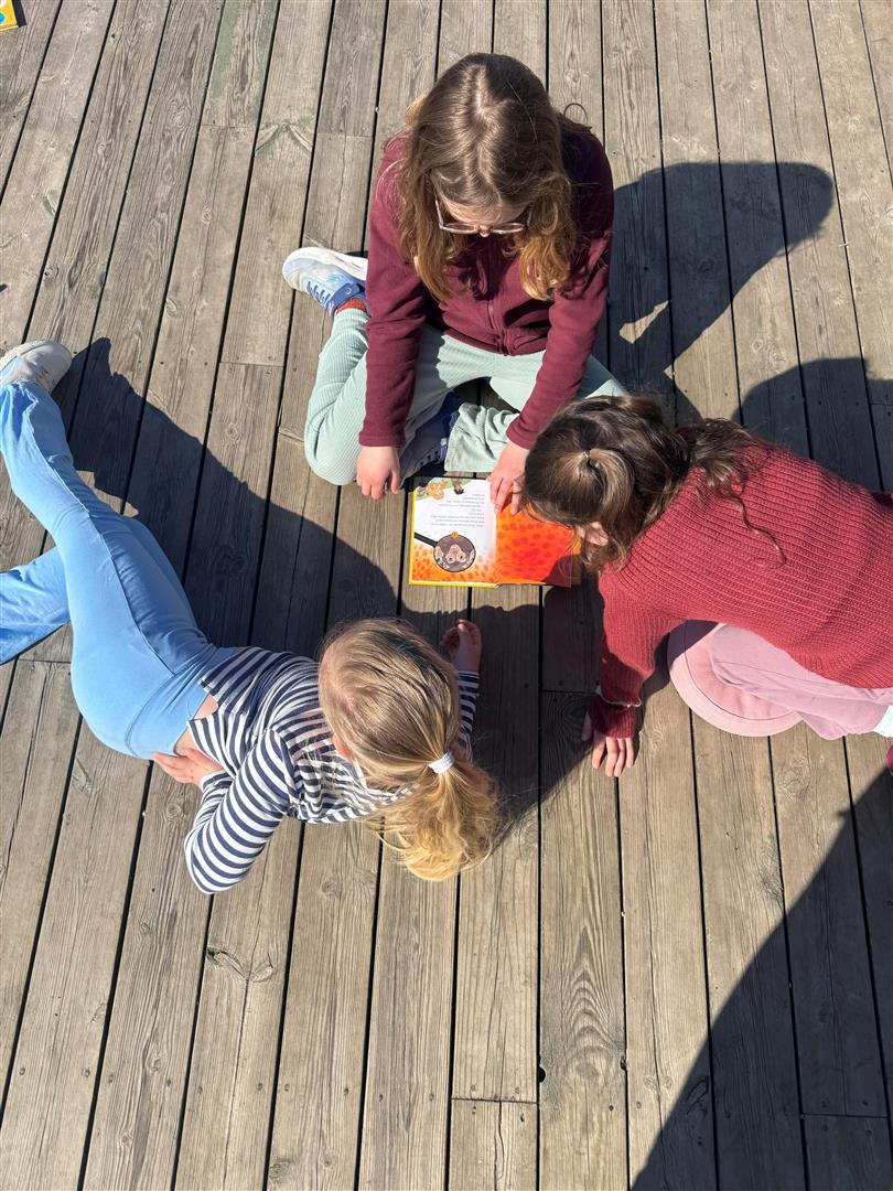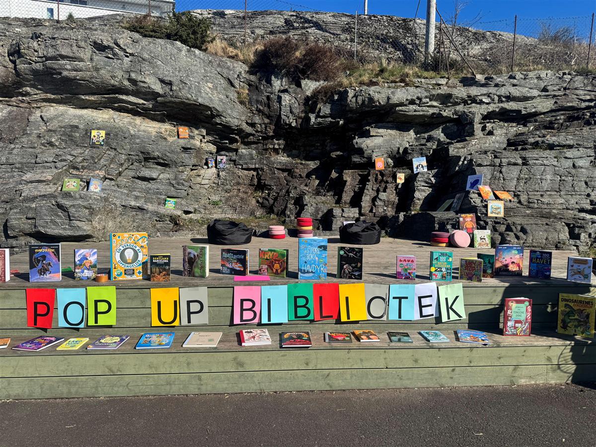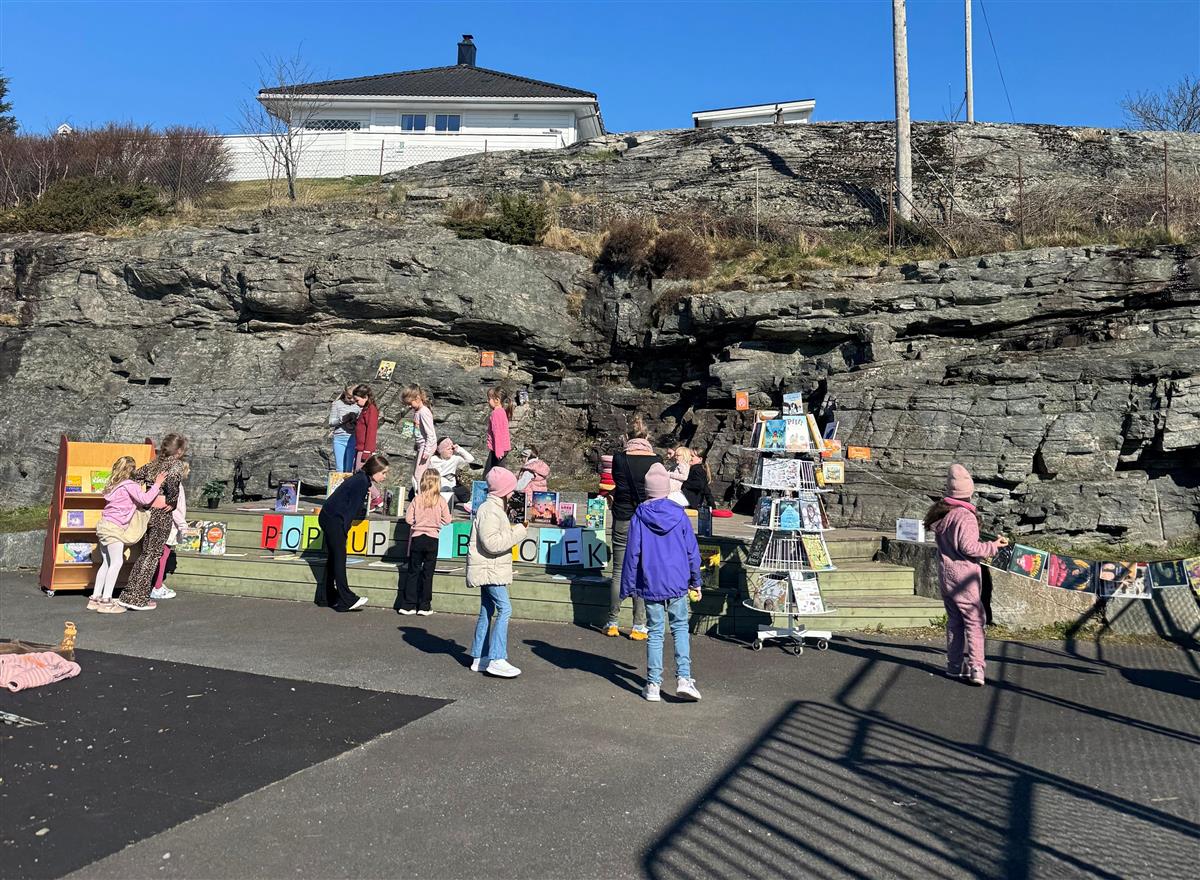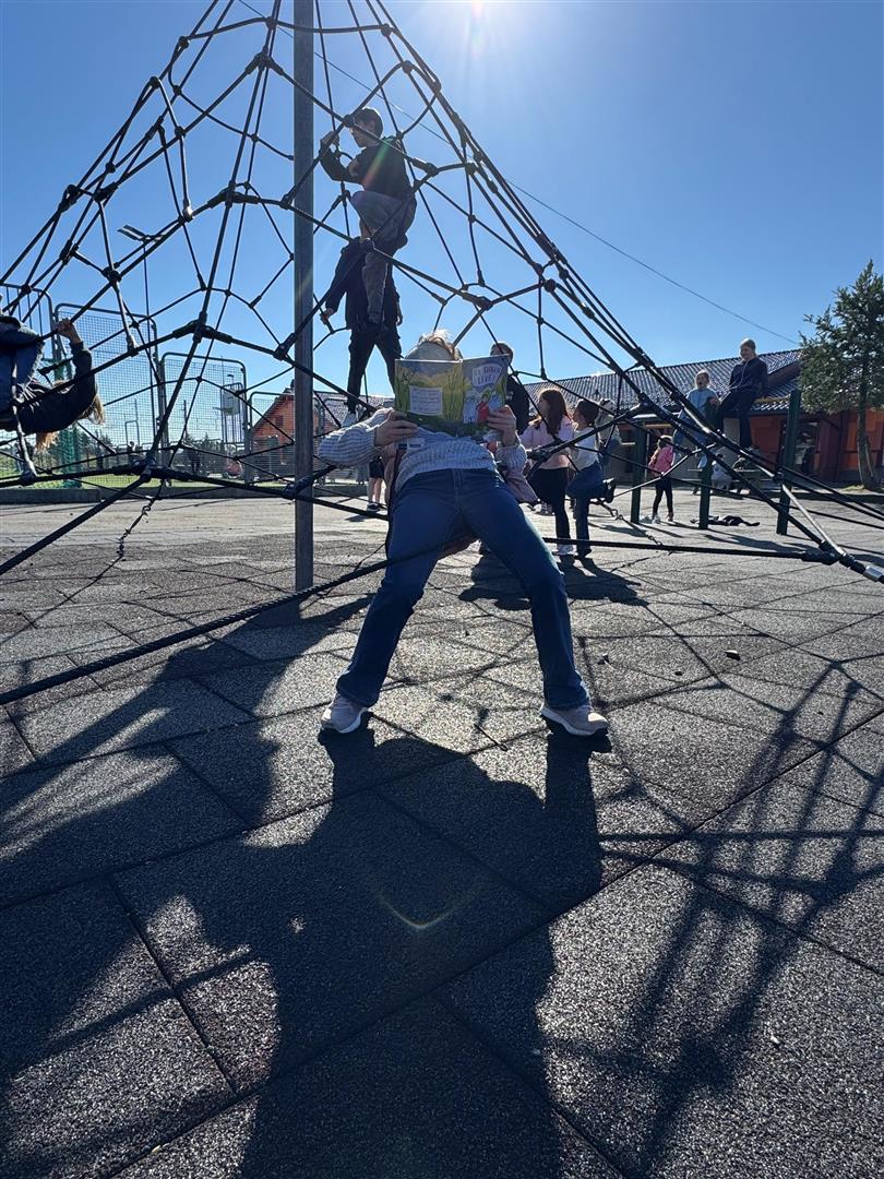 Tysdag hadde vi pop-up bibliotek i storefri. Alle elevar og vaksne var inviterte. Elevane fann sjølv fram bøker og kosa seg med eit bokbad ute i sola heile friminuttet. Å lesa i klatrestativ var ikkje nokon hindring. Absolutt ein suksess som vi vil gjera fleire gongar på Rong skule.