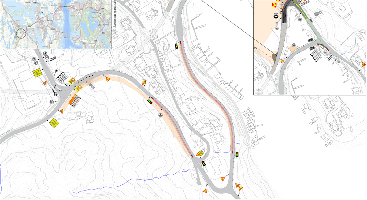 Kart/skisse: Sotra LinkMontering av trafikktiltak startar fredag 13. februar fra kl. 09.00. Sjølve anleggsarbeidet tek til måndag 16. februar kl. 07.00.