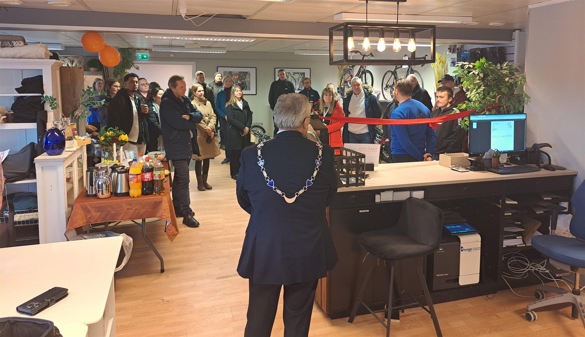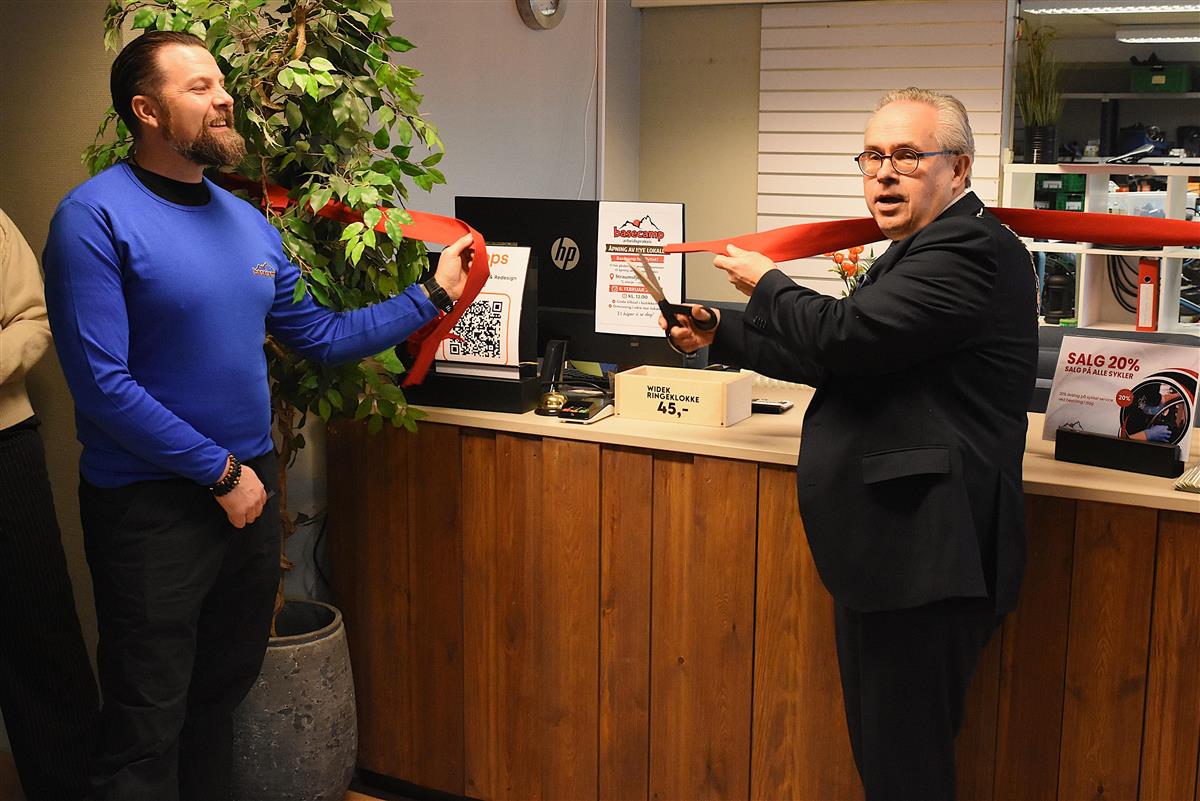 Ordførar Tom Georg Indrevik klipte snora for å markera det nye lokalet for offisielt opna. Til venstre; dagleg leiar i Basecamp Martin Ingvaldsen.Basecamp arbeidspraksis er samansett av sykkelsal/verkstad, repro og matbank og er no lokalisert i andre etasje i Jula-bygget i Straumsfjellvegen 1. Det er god parkering ved inngangen. Dette gjer det enkelt for kundane som skal henta og bringa inn syklar.