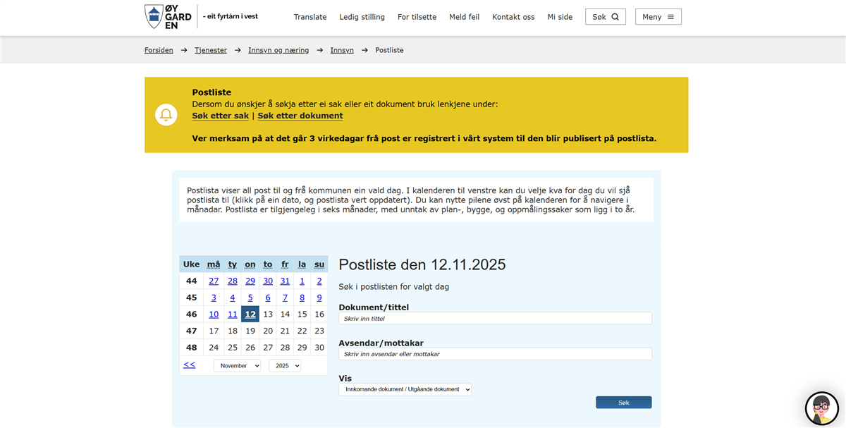 Systemet vil ikkje vera tilgjengeleg i denne perioden. Det betyr mellom anna at det ikkje vert publisert nye dokument på postlista før 1. desember 2025. Dokument som allereie er publiserte i postlista vil framleis vera tilgjengelege.