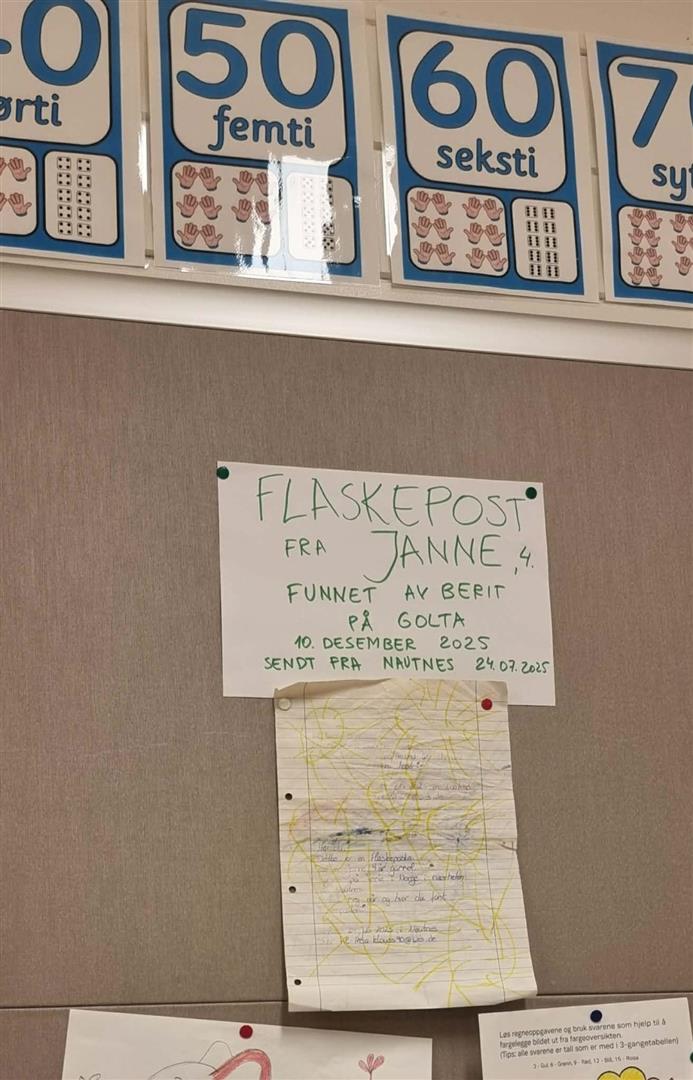 Vi las historia høgt i klasserommet med god hjelp frå morsmålslærarane, og dei flotte illustrasjonane gjorde det òg lettare å forstå. Ekstra gøy var det jo at elevane i desember fekk sjå ein ekte flaskepost som ein av lærarane fann på Golta. I den var det riktignok ikkje noko kart til ei mystisk øy, men eit brev frå ei tysk jente på fire år.