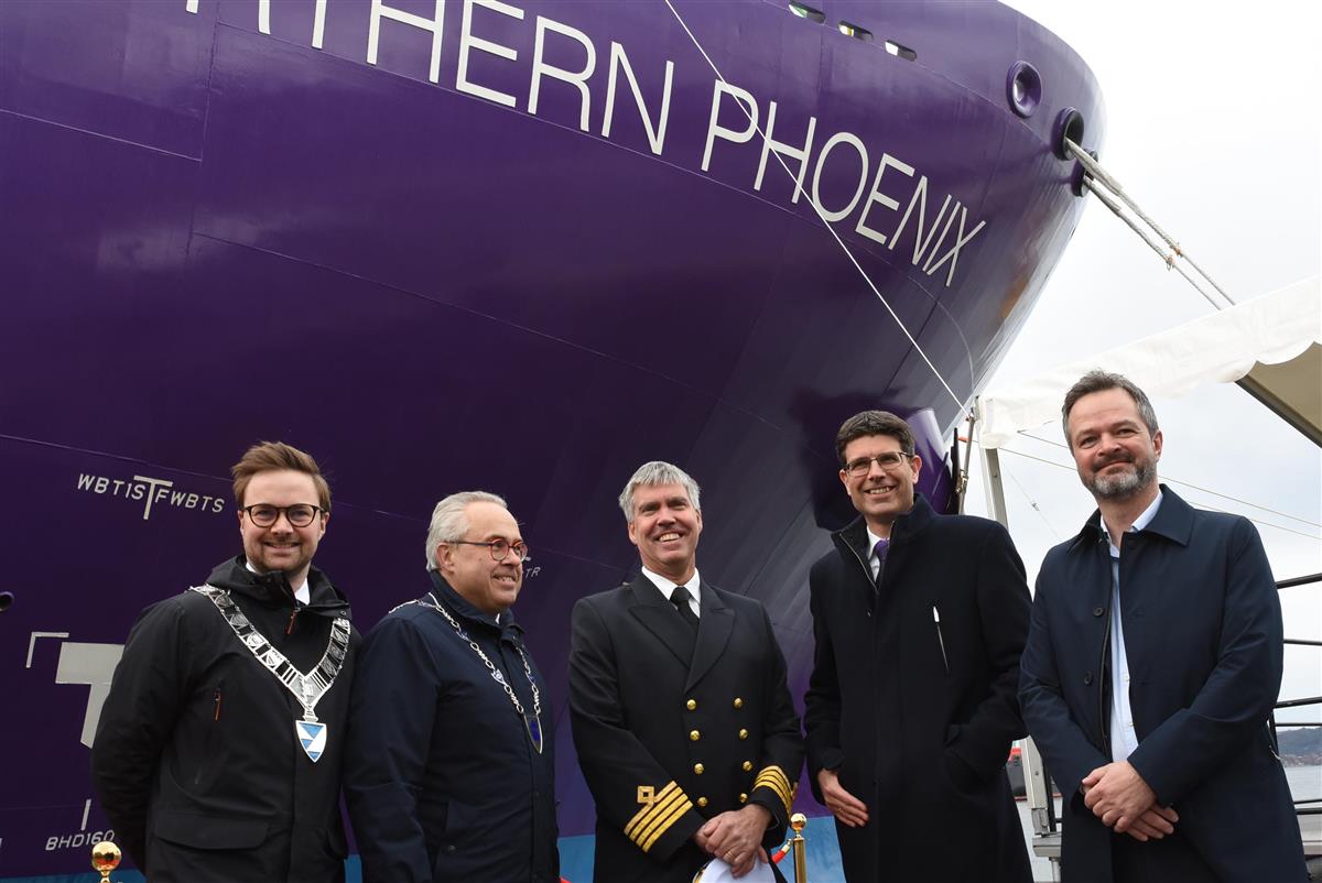 Det var tilsett i Northern Lights, Linn Hamre, som var gudmor ved skipsdåpen. Ho ønskte Northern Phoenix og mannskapet god vind og sjø.
