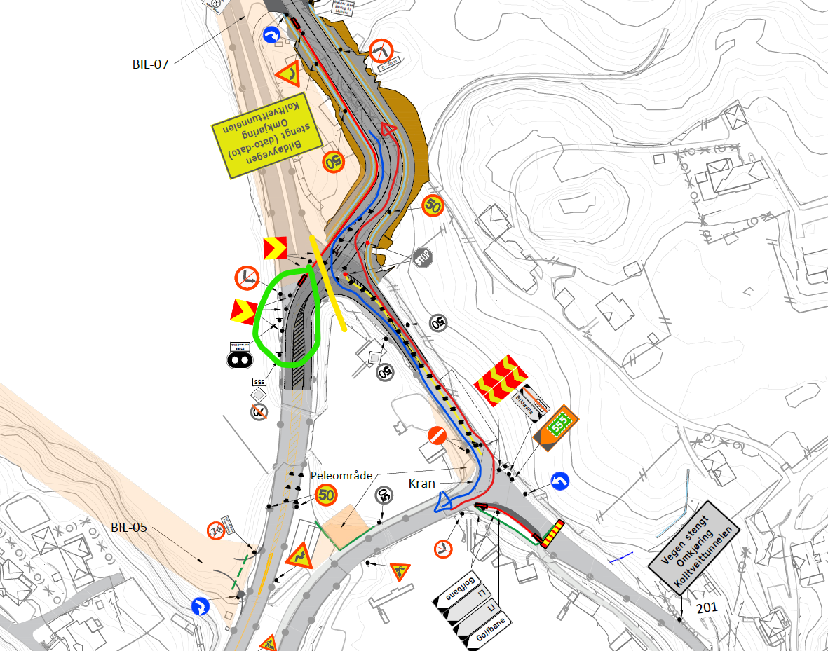 Trafikken vert leia via Bildøybakken og inn på riksveg 555 frå Bildøyvegen. Det vert opna for tovegskøyring i Bildøyvegen i denne perioden. Naudetater kan passera.