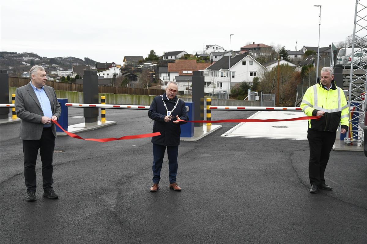 Ordførar Tom Georg Indrevik klipte snora. Til venstre; administrerande direktør i ØyVAR, Bjarne Ulvestad og prosjektleiar i ØyVAR Tor Brakstad.Under markeringa på måndag takka han entreprenør Brødrene Ulveseth og Trigger for godt samarbeid. Han takka også prosjektleiar og anleggsleiar og alle dei andre tilsette i ØyVAR for tolmod og god jobb med prosjektet.