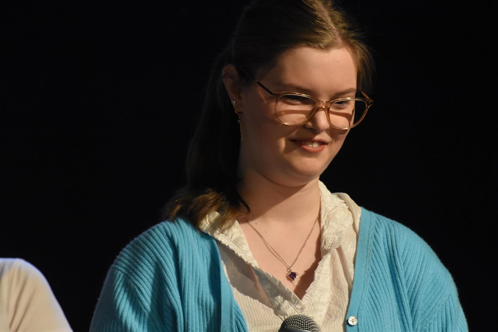 - Eg har litt nervar, men det er kjempekjekt å ha denne rolla. Det vanskelegaste er å ikkje le når eg ikkje skal le. Det skjer jo ein del småtabbar undervegs. Då kjem gjerne latteren. Det er mykje dialog, og det gjer det lettare å hugsa replikkane. Med dette prosjektet kjem vi tettare på elevar som vi gjerne ikkje har så mykje med å gjera elles, seier Emine.