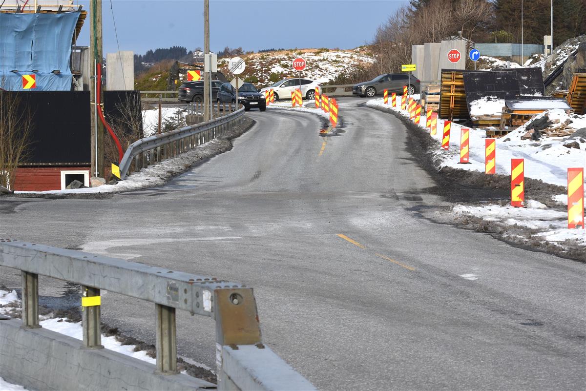 I øvre del av Bildøybakken vert vegen innsnevra til eín køyrebane ved bruk av betongelement. Trafikken vert regulert med trafikklys.