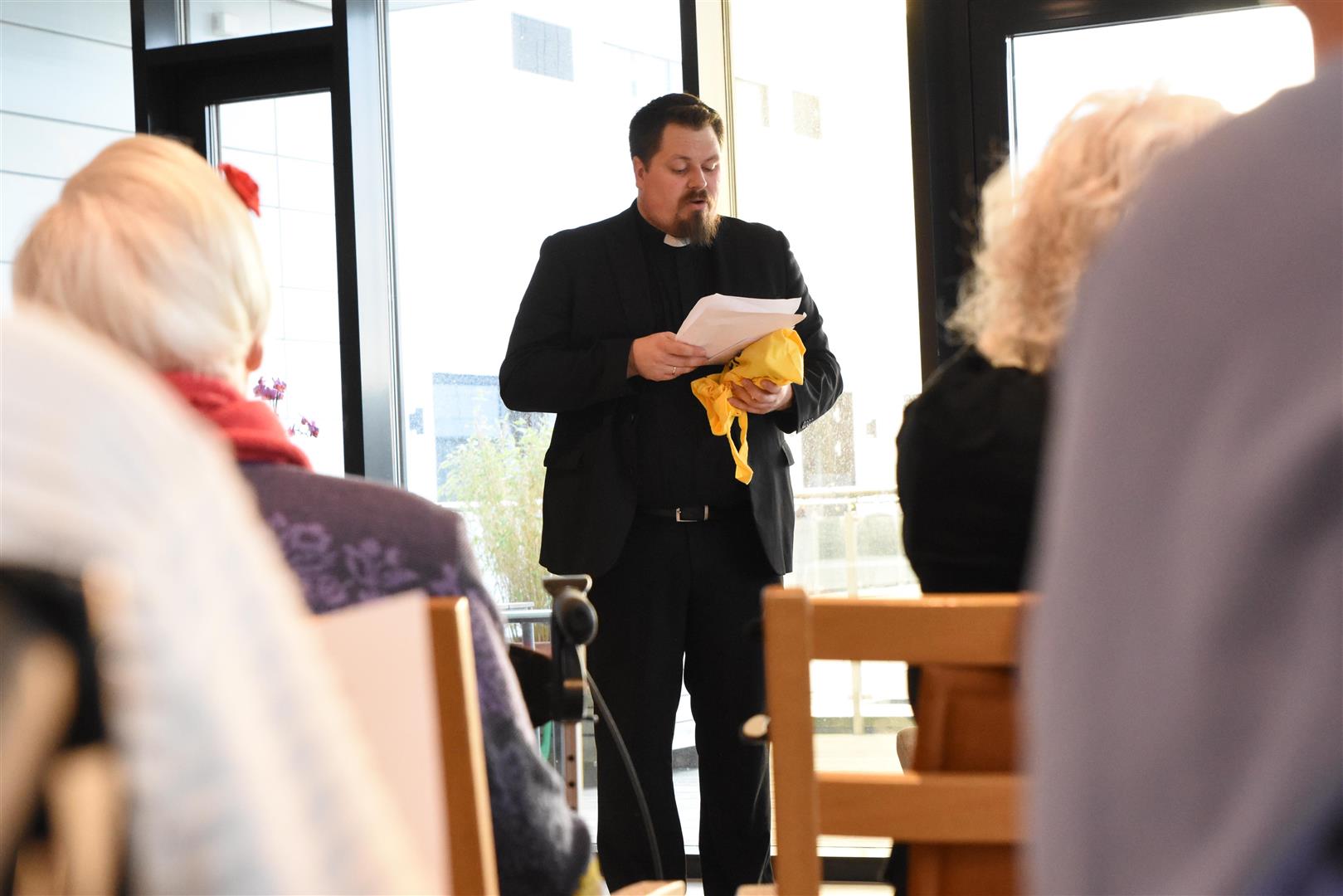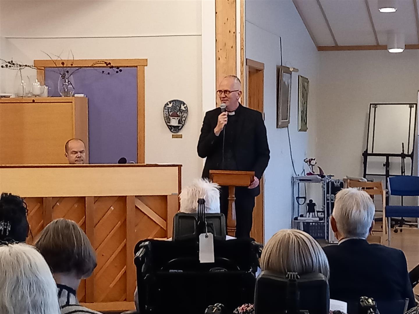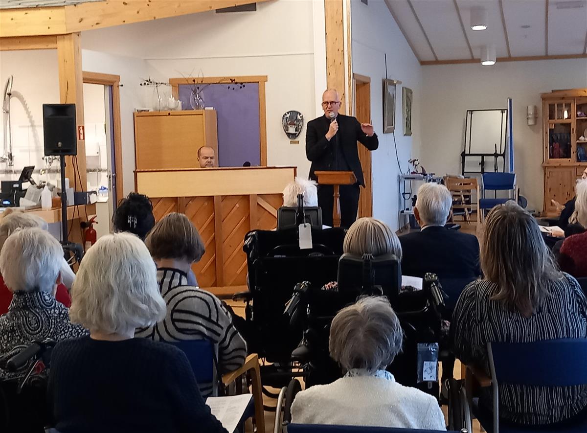 Frå gudstenesta på Tednebakkane omsorgssenterLeiar i plan- og miljøutvalet, Børge Haugetun, sa at det er ein flott tradisjon at det vert halde gudsteneste på sjukheimane på julaftan. Han takka dei tilsette som arbeidar i jula på vegner av kommunen og takka kyrkja for at dei gjer det mogleg for bebuarane og pårørande å få julegudsteneste.