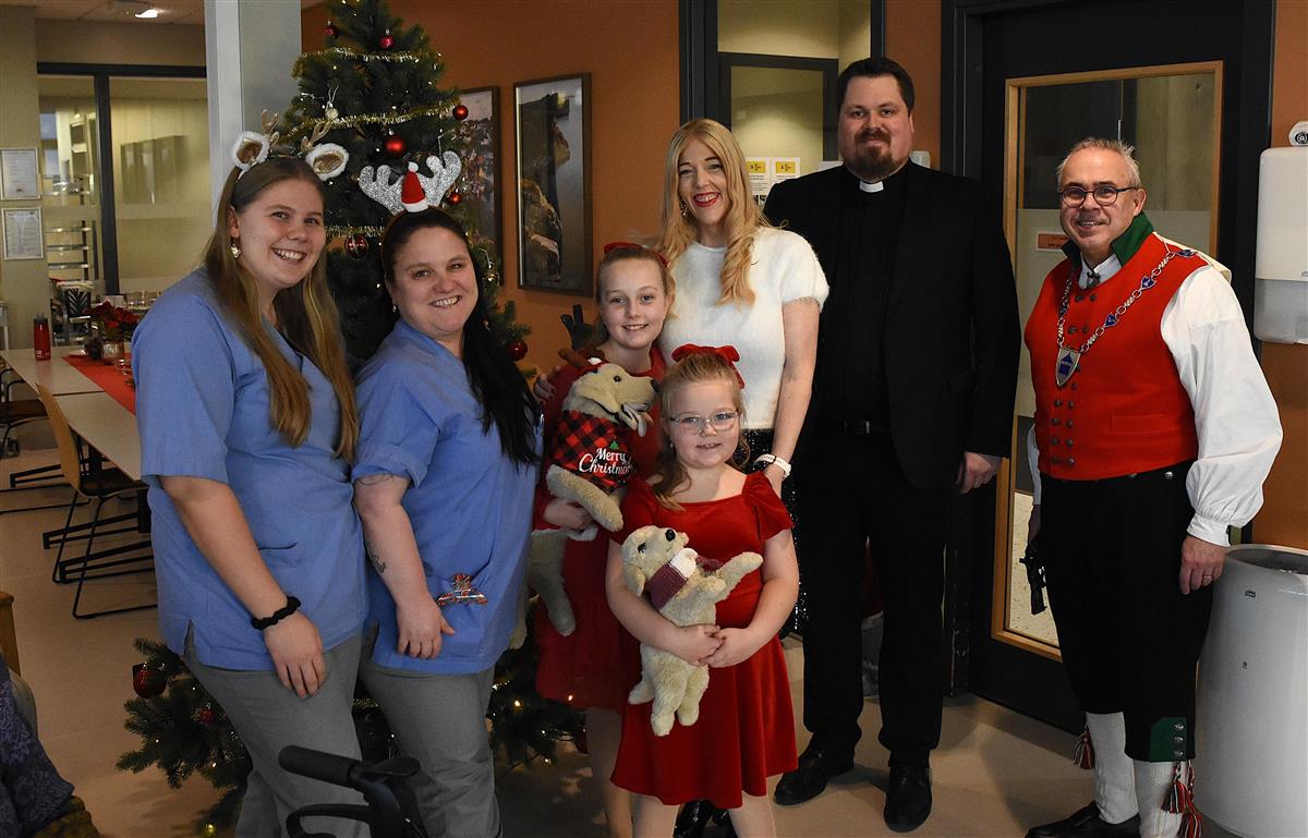 Frå samlinga på Øygarden lokalmedisinske senter. Frå venstre; Emma Sofie Heggernes, Anita Sandvik, Matilde Algrøy, Savannah Algrøy, Solveig Konstanse Algrøy, Ole Kristian Hamre og Tom Georg Indrevik.Rundt om på institusjonane var det gjort klart for besøk på julaftan. Mange av bebuarane skulle feira jul saman med familien seinare på dagen, medan andre feira dagen på plassen.