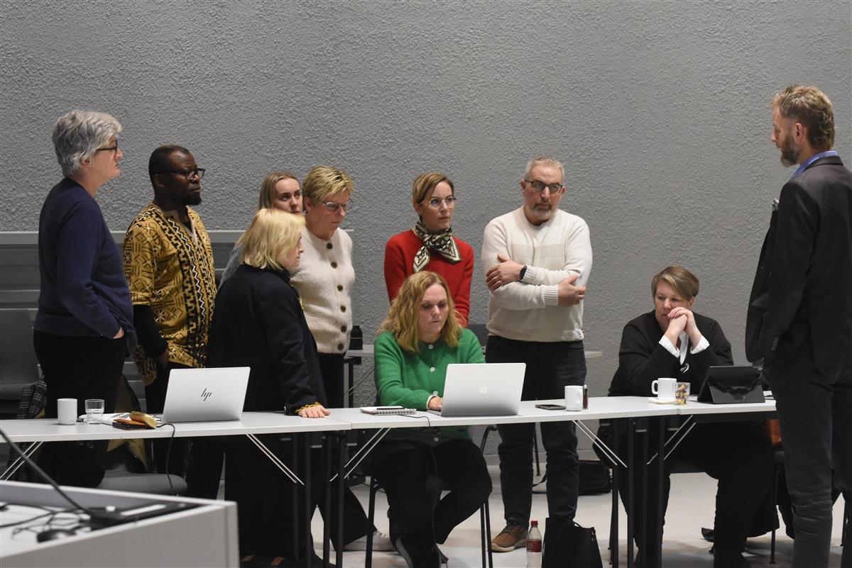 Drøfting i pausen i saka om stenging av Gamle Straumsundet bru.PMU var samla til møte på torsdag.