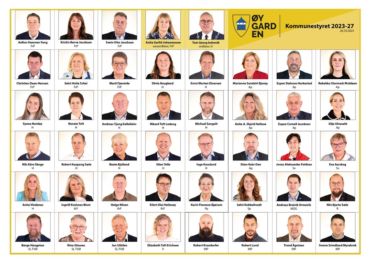 Kommunestyret ny visingLytt til tekstenStopp avspillingØygarden kommune har 45 medlemmer i kommunestyret.Kommunestyret er kommunen sitt øvste styringsorgan. Oversikt over kommunestyret sitt ansvarsfelt finn du i kommunen sitt delegeringsreglement, punkt 2.Kva er eit kommunestyre?Kommunestyret er kommunen sitt øvste politiske organ. Kommunestyret består av medlemmer og varamedlemmer vald av kommunen sine innbyggarar ved kommuneval kvart fjerde år. Inneverande kommunestyreperiode er frå 2023-2027.Kommunestyret - samansetjingØygarden kommune har 45 representantar i kommunestyret frå ulike parti. Kommunestyret vert leia av ordføraren.Møte i kommunestyretKommunestyret har omlag 8 møte i året.Møta går for opne dører og vert overført direkte på kommune-TV. Du kan også sjå opptak av tidlegare møte.Møteplan og representantar i kommunestyretHer finn du oversikt over møte i kommunestyret og sakspapir til møta.MedlemmerHer finn du oversikt over ordførar og representantar i kommunestyret med kontaktinformasjon.ReglementReglement for møte i folkevalde organDelegeringsreglement for Øygarden kommuneSekretariatKontakt politisk sekretariat Oversikt over tidlegare kommunestyrerepresentantarKommunestyret 2019 - 2023 Sist endra 14.01.2026 09.54