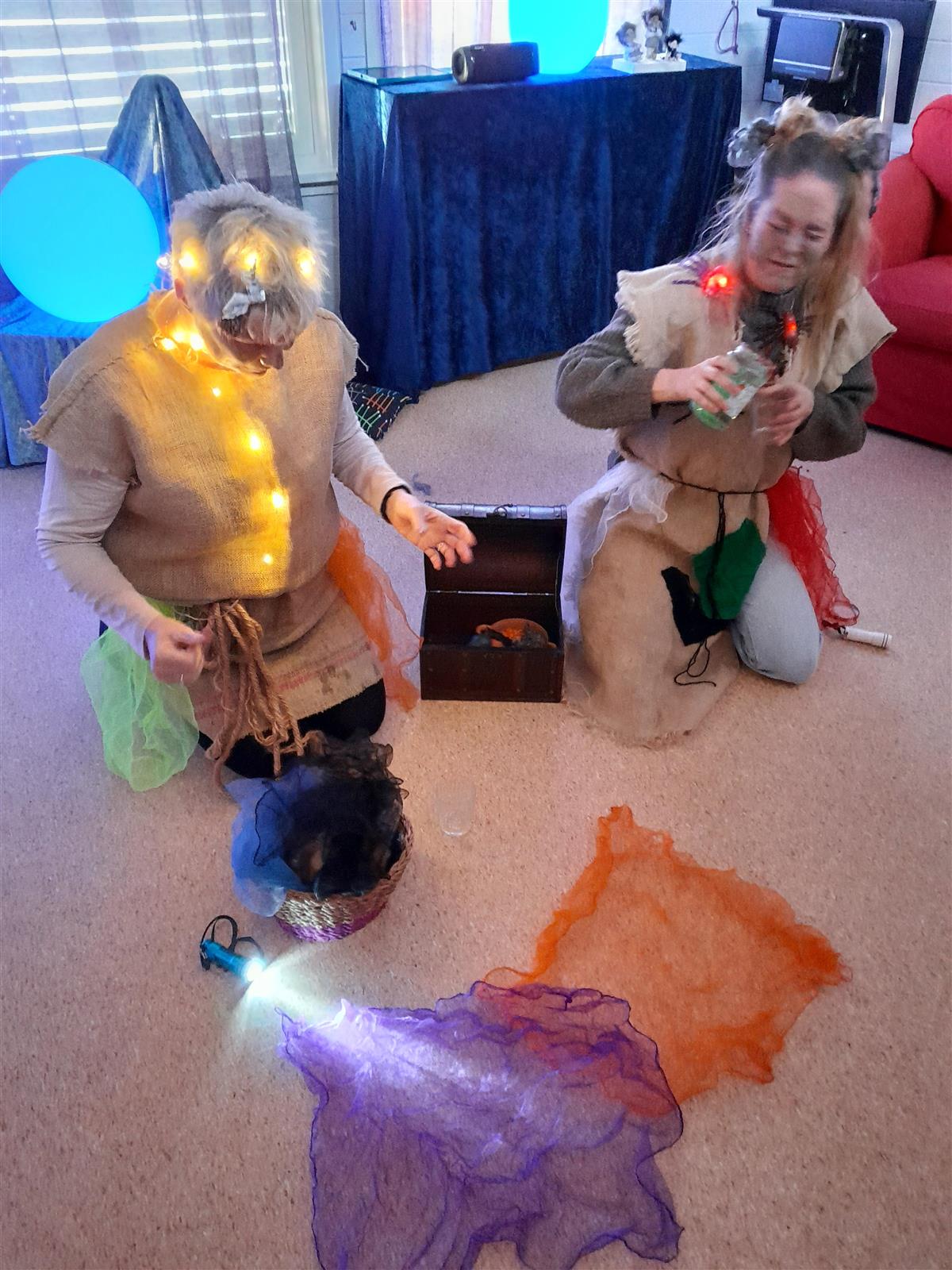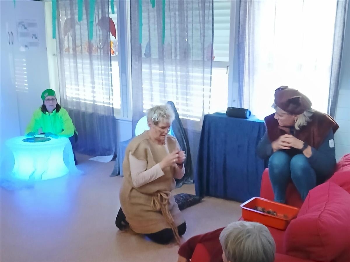 Vi fekk besøk av to troll som heit Lurvefot og Mosedott. Dei skulle på fest og hadde tatt med seg ein spennande kiste med mat og drikke. Maten dei hadde med var edderkoppar, ekornbæsj og ei drikk laga av musehalar, flaggermusvingar og froskeslim. Da rynka barna på nasen, men det var også spennande og morosamt. Barna meinte trollene måtte dele maten sin med dei og at trollene ville føle seg betre om dei delte. Etterpå fekk alle servert trollgraut til lunsj.