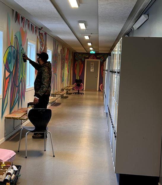 Alle dei fem niande klassane fekk ein vegg dei skulle dekorera, så då blei både scenen i gymsalen og heile 500-gongen pynta med fargerik graffiti.