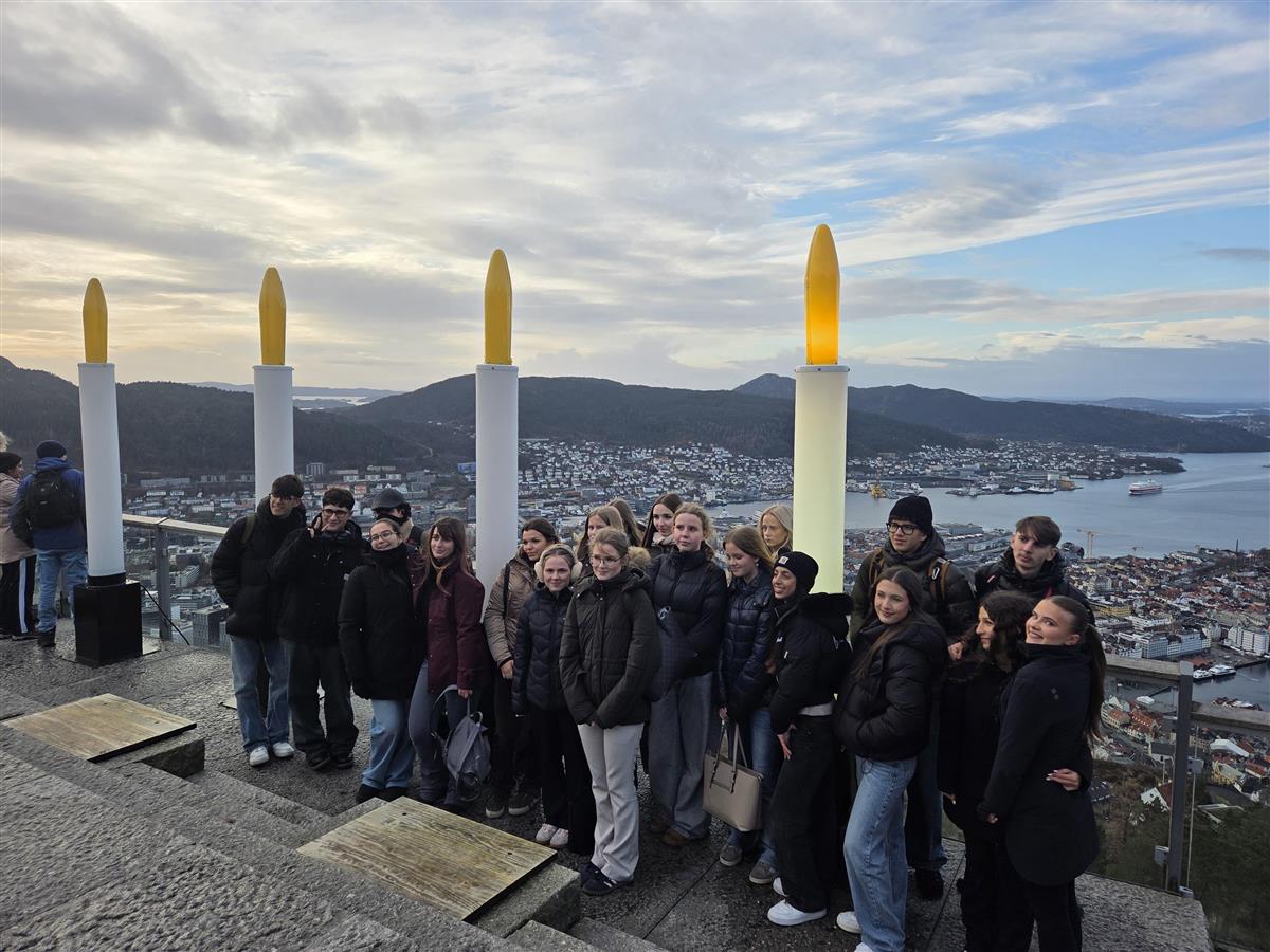 Ti elevar frå valfaget internasjonalt samarbeid var for nokre veker sidan på mobilitet i Italia. Der budde dei hos italienske vertsfamiliar og fekk oppleve det autentiske italienske kvardagslivet. No er det vår tur til å vere vertskap: Dei same italienske elevane er på besøk hos oss, og denne veka får dei utforske norsk kultur med særleg fokus på folkeeventyr, troll og andre overnaturlege skapningar. Vi har allereie besøkt Trollmuseet i Bergen og gått tur i Trollskogen, og vidare står både peparkakebyen og ein porsjon ekte bergensk fiskesuppe på programmet. På fritida har dei italienske elevane elles vore med på å lage peparkakehus, bowling, klatring og testing av norsk frosenpizza. Det var ikkje så verst, meinte dei.