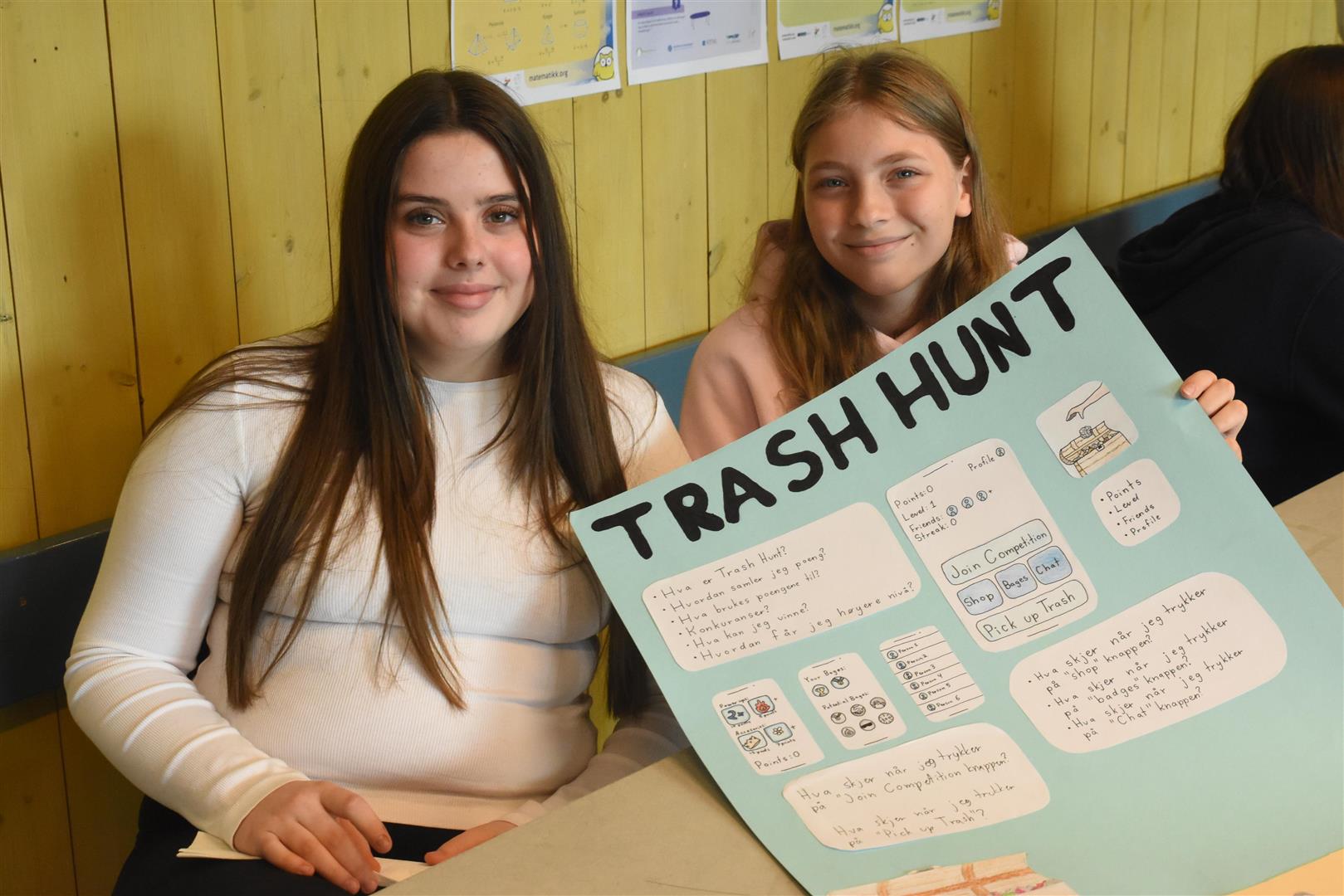 Pernille Ulvøy (til venstre) og Kine Ekerhovd har funne ei løysing på korleis vi kan redusera matsvinnet.Naturfaglærar Oda Bueie Dalin vart inspirert av Energimessa på Sartor Storsenter sist veke. Der deltok også Sund ungdomsskule, men med den lokale varianten dei siste dagane fekk 70 elevar, stort sett to og to, oppgåver med å finna draumeprosjekt som løyser utfordringane knytt til klima og berekraft.