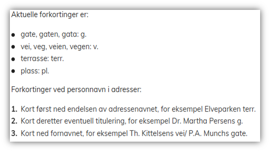To av dei vedtekne namna har meir enn 22 posisjonar, og treng difor ei forkorting av namnet til bruk i alle offentlege og private register, medan tilvisingsskilt kan ha det fulle namnet for adressenamnet. Det skal vera punktum bak forkortinga, og ein hovudregel er at etternamn ikkje skal forkortast.