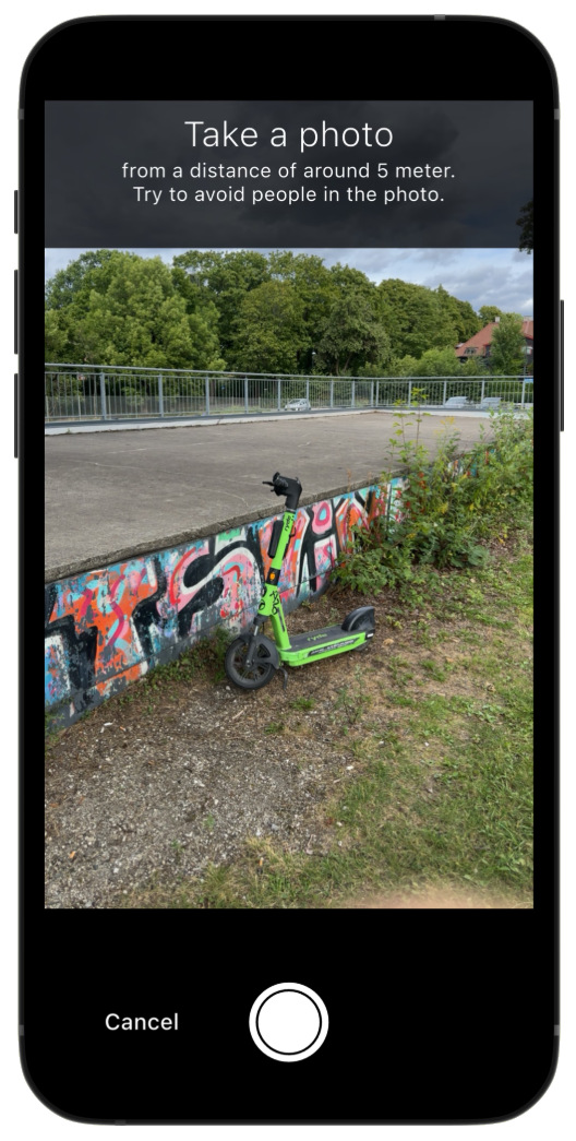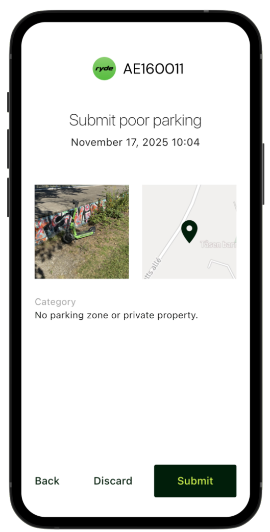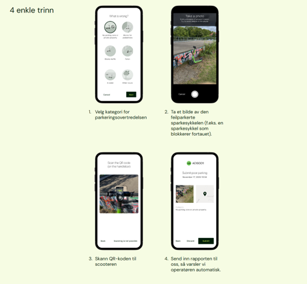 Du kan bruka appen Feilparkering for å melda frå om feilparkerte sparkesyklar. Når du sender inn ei melding, får driftsteamet til utleigefirmaet varsel, og kommunen får kopi.