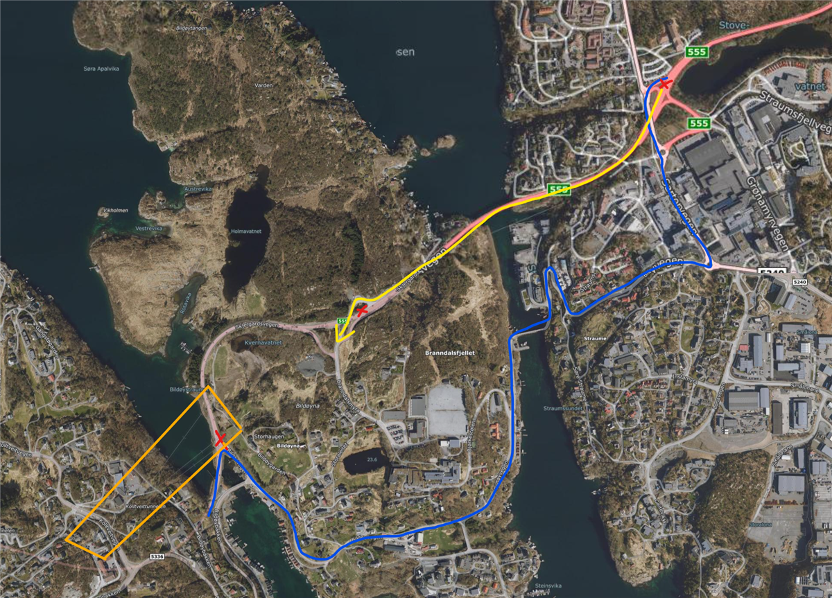 Arbeidsområdet er markert med oransje på skissa, med omkøyring i blått for vanleg trafikk på riksveg 555 trafikk, og gul for bebuarane på Bildøyna.