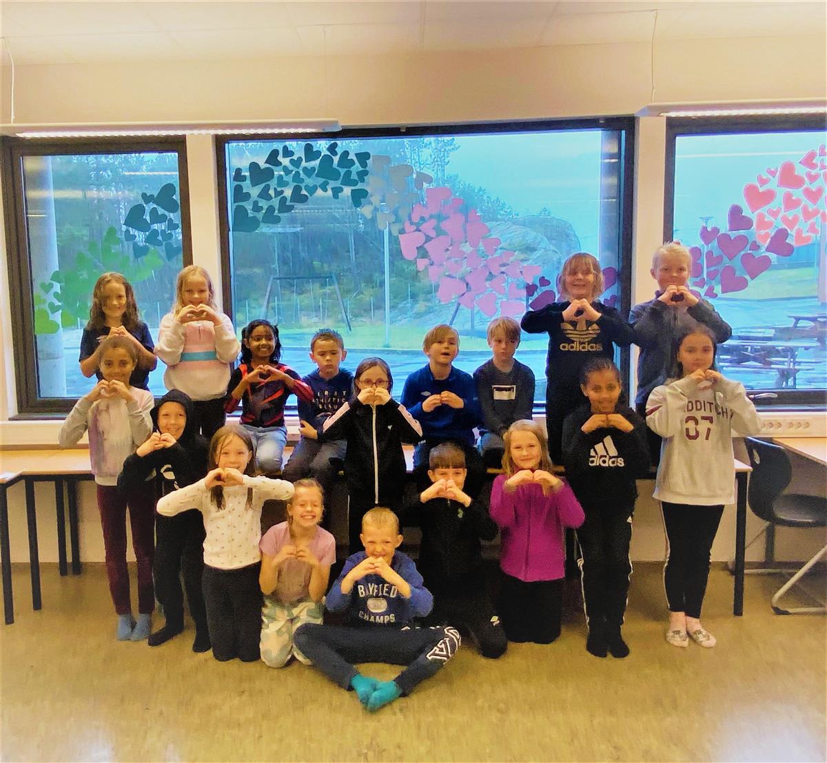Alle elevar var med i eit hjarterebusløp ute på ein regnfylt dag. Etterpå vart det boller / kake før ein gjekk på Haustferie. 3. klasse laga eit eige "hjartebilete" med seg sjølve og dekorasjonane i vindauget. Med denne helsinga ynskjer vi alle ein fin haustferie.